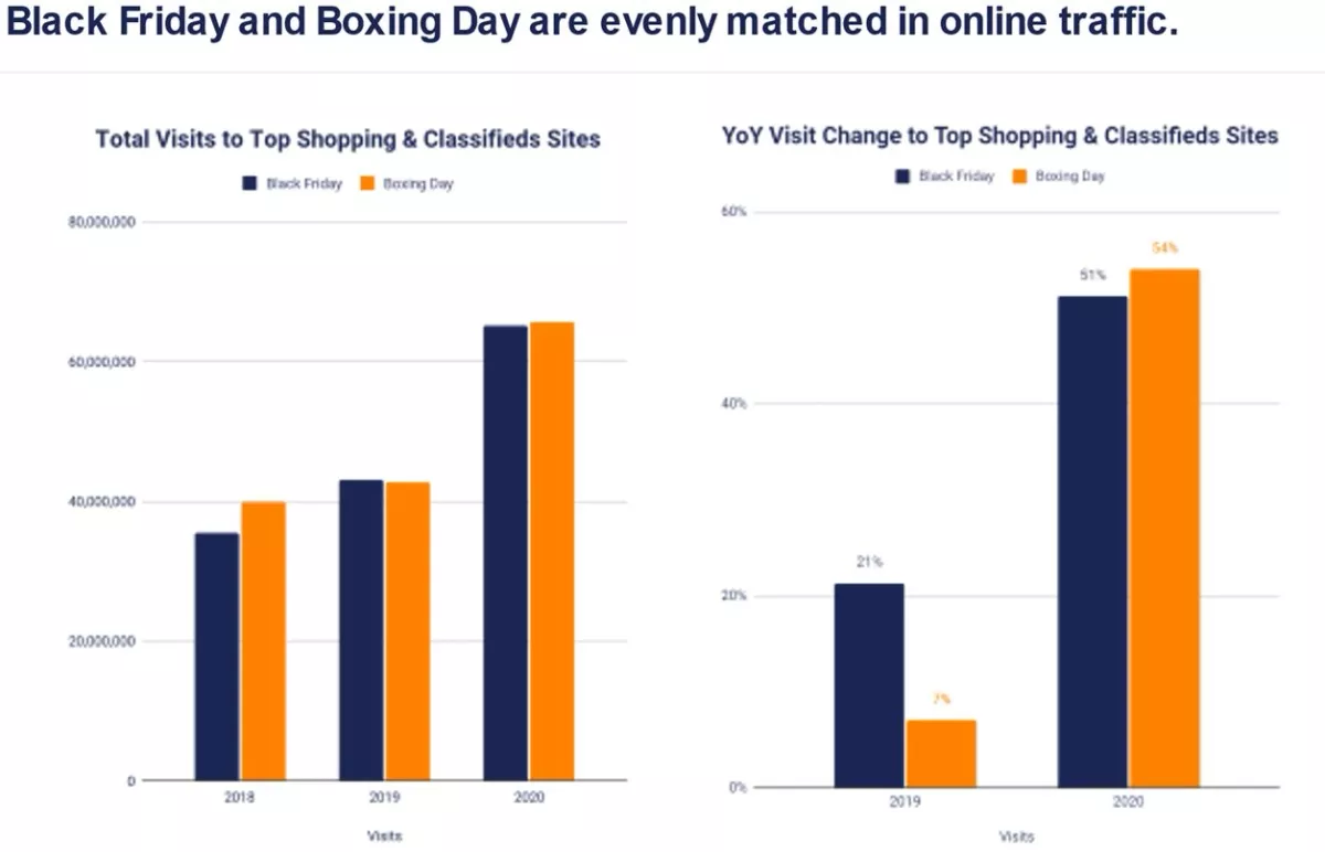 In 2020, Black Friday and Boxing Day sales traffic rose 50% year-on-year, accounting for 20 million more visits per event. It was clear consumers adapted to lockdowns and took their end-of-year shopping habits online.
