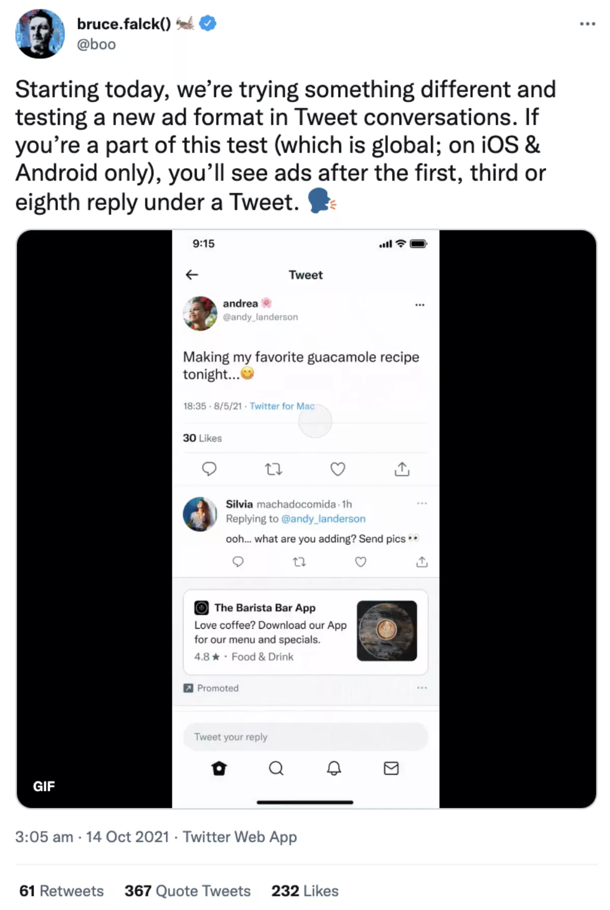 Twitter's revenue product lead Bruce Falck posted the news on Twitter demonstrating how the ads will appear in tweets.